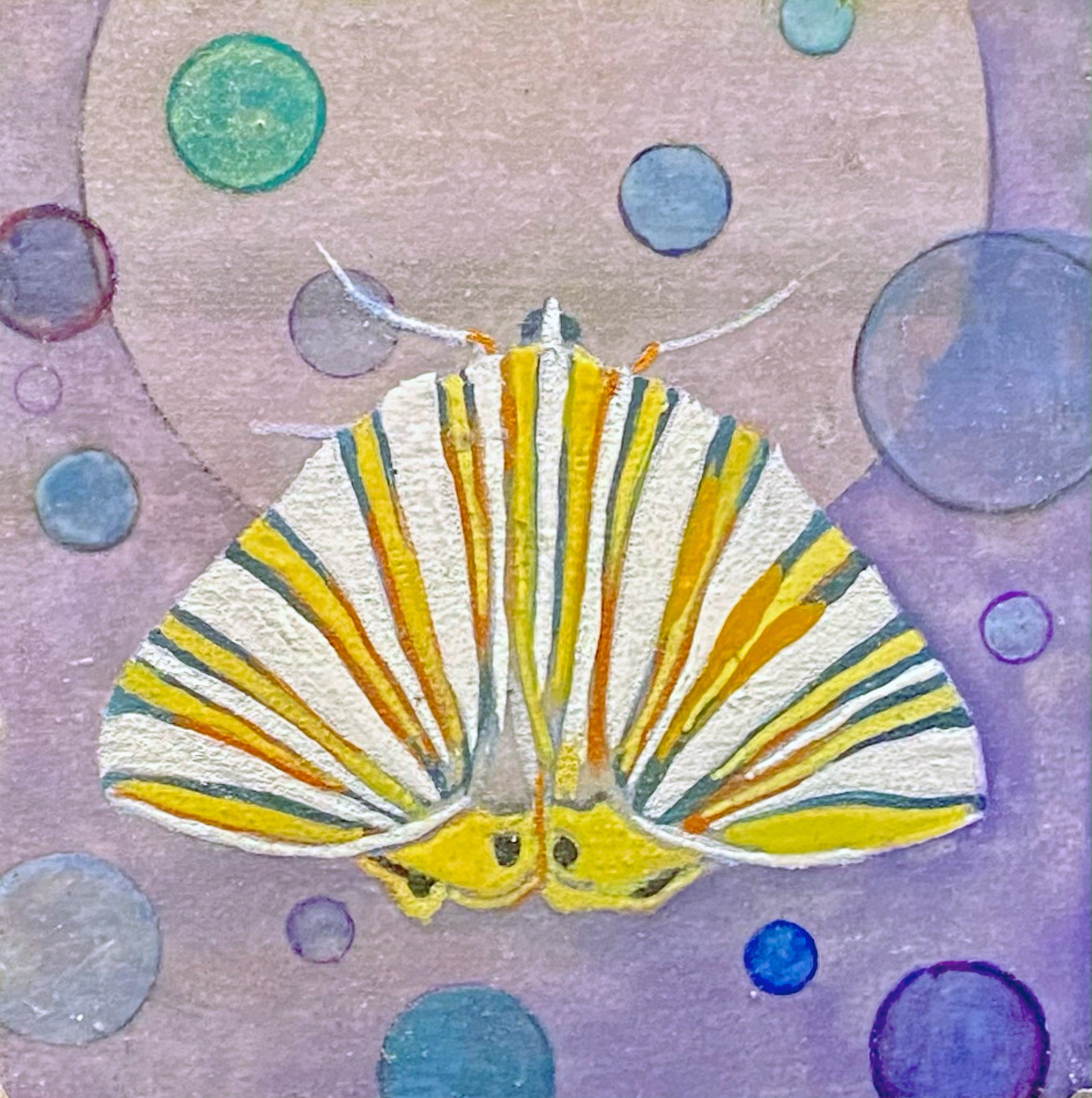 Moth 7, 4 x 4 in, Oil, Pastel, Enamel, Ink on Panel